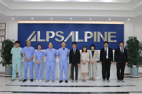 在首先访问的大连阿尔卑斯电子有限公司,总领事和首席代表听取了该公司于文武副总经理对公司发展沿革、业务内容以及今后展望等情况的介绍,随后在于副总经理的陪同下参观了汽车用模块制品和车辆组件生产工厂。