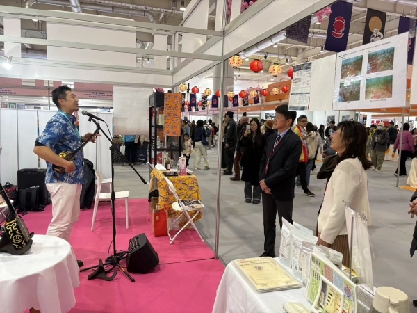 沖縄県ブース(在外公館長表彰受賞者 西原圭佑氏による三線の演奏)