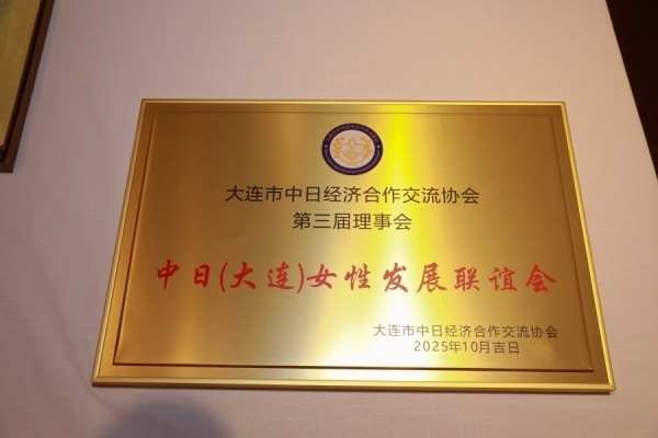 また、その後の懇親会では、大連市中日経済合作交流協会及び中日(大連)女性発展聯誼会の活動紹介動画、日本在住の友人代表からのビデオレターが放映された後、徐朝法・中日経済合作交流協会会長から洪涛・同協会監事長兼女性発展聯誼会会長に、「中日(大連)女性発展聯誼会」のプレートの授与が行われました。