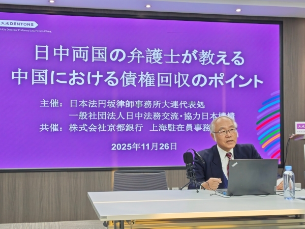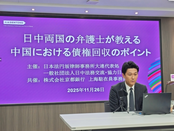 本次研讨会以“日中两国律师讲授在中国债权回收的重点”为题,由法圆坂法律事务所大连代表、一般社团法人日中法务交流・协力日本机构主办,京都银行股份有限公司上海代表处协办,日中双方法律事务所、企业相关人员约40人在线上线下参与其中。
