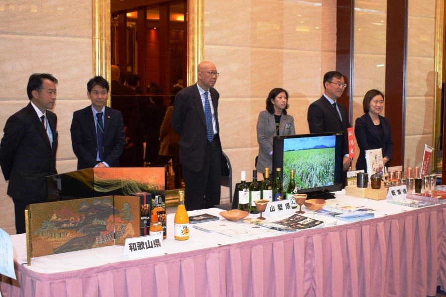会场上,邀请宾客品尝来自和歌山县的梅酒、山梨县产的白葡萄酒、以新潟大米为原料的饭团以及和歌山县蜜橙甜点,以此向嘉宾介绍日本地方城市的魅力。